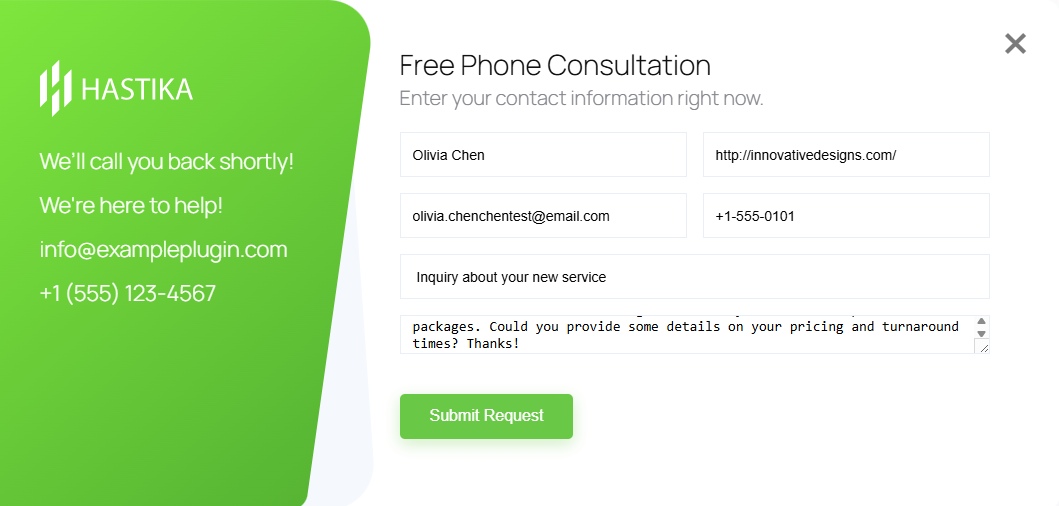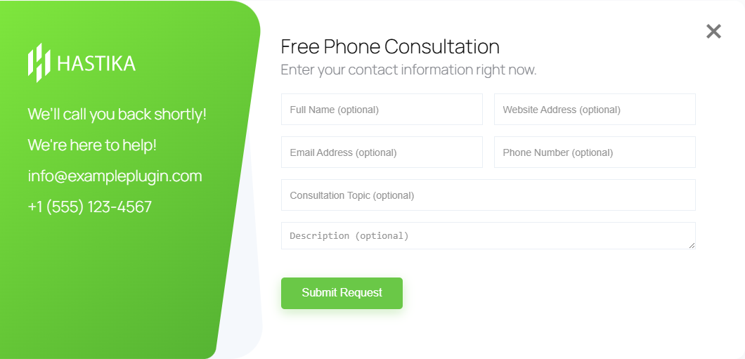 By activating this plugin on your WordPress site, an attractive and customizable consultation call button will appear on the screen. Users can click on it to fill out a call request form and submit their contact information. This allows you or your support team to contact them as soon as possible.