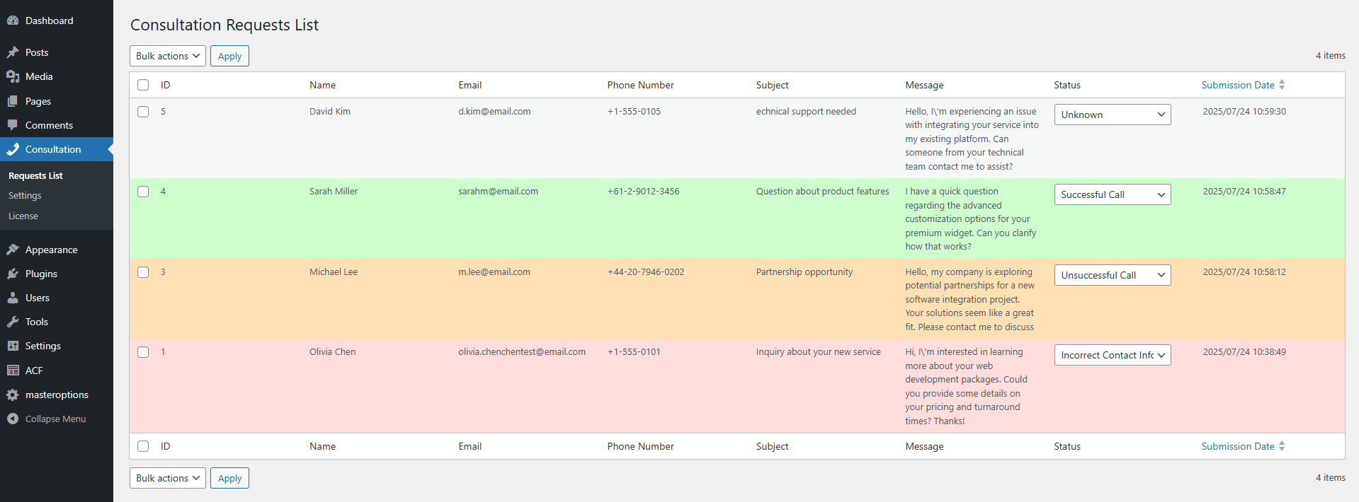 In the plugin’s administration panel, a list of all user consultation requests is displayed. Each request includes the information submitted by the user and the call status. The statuses include: